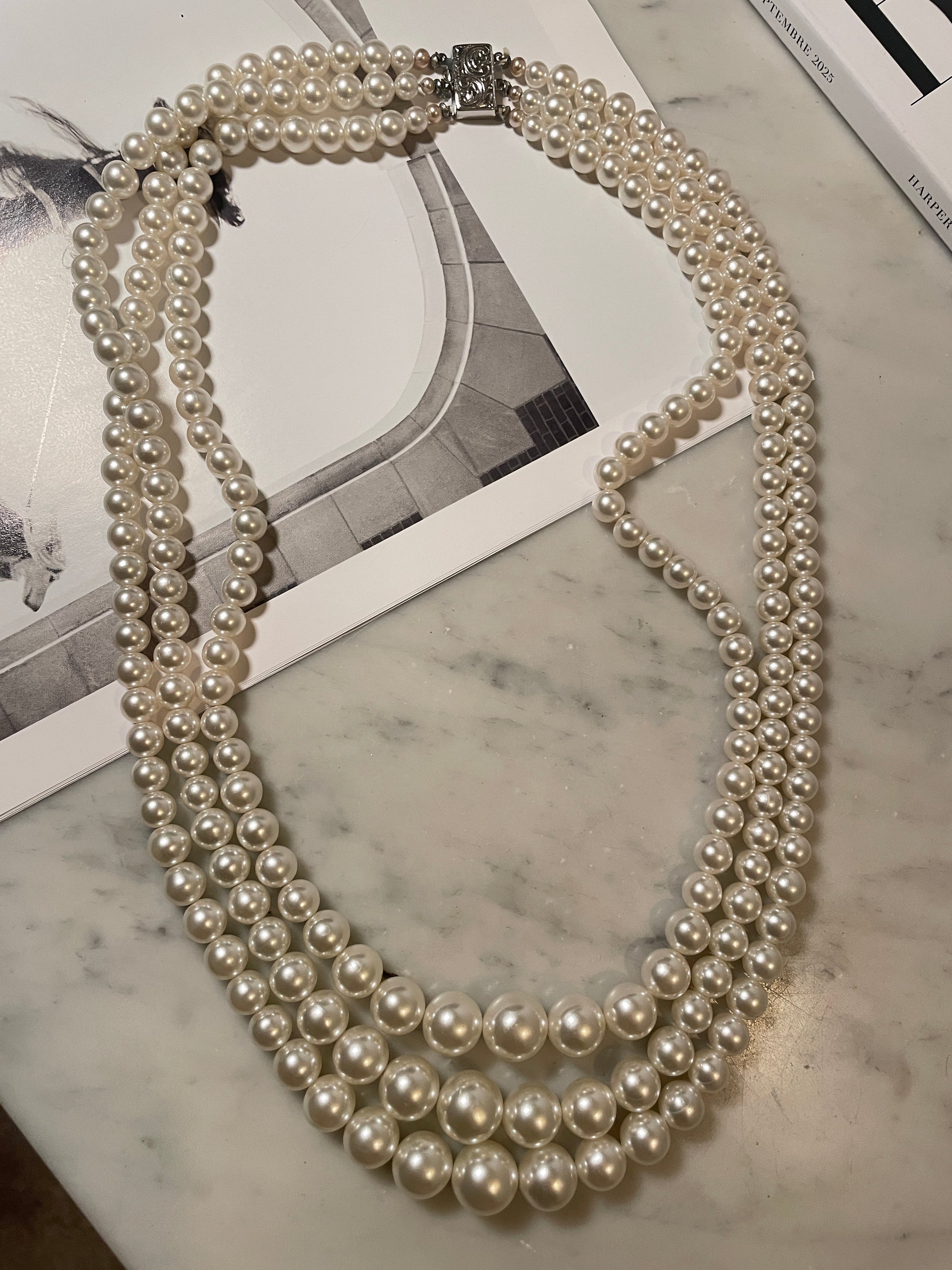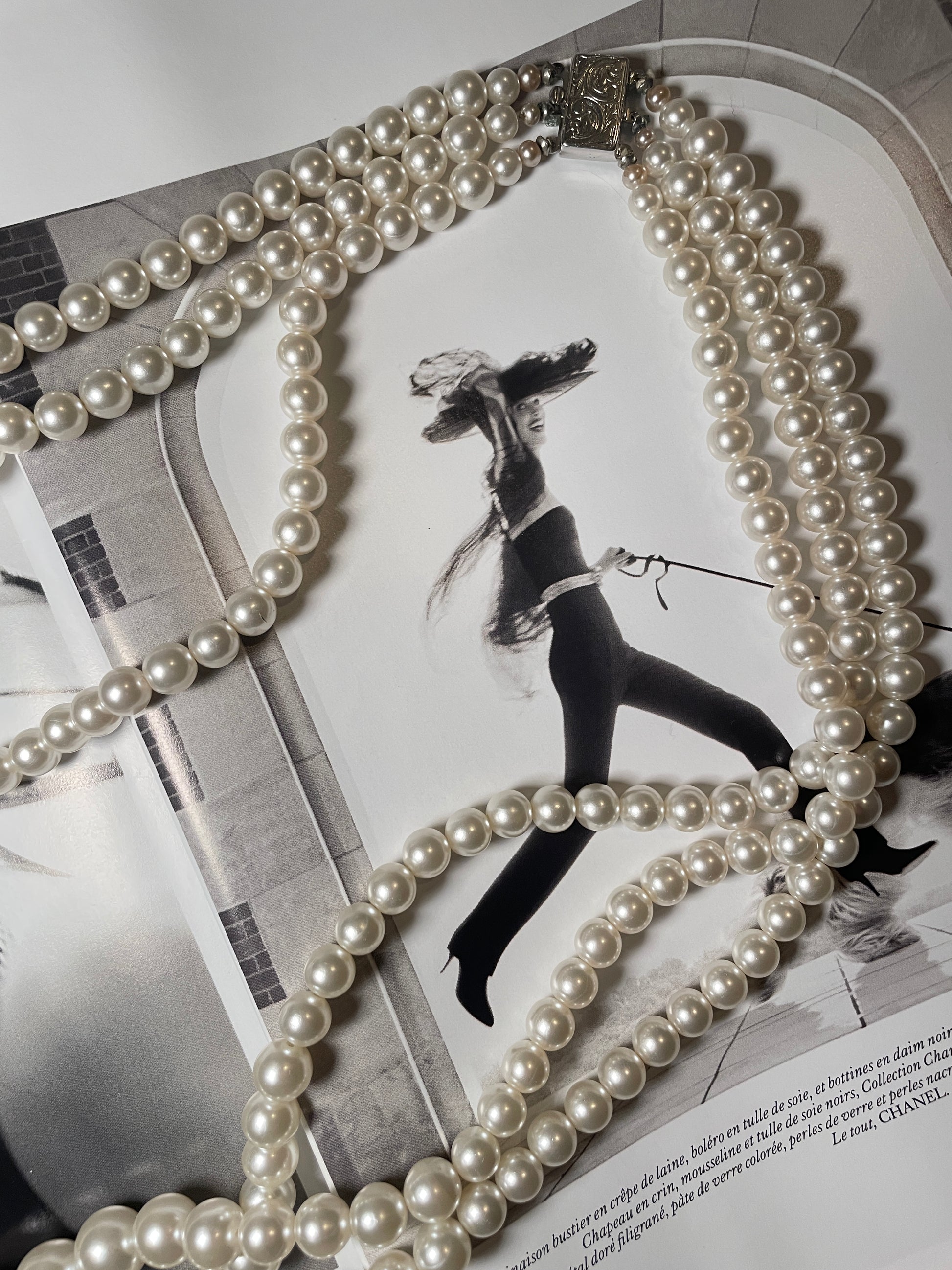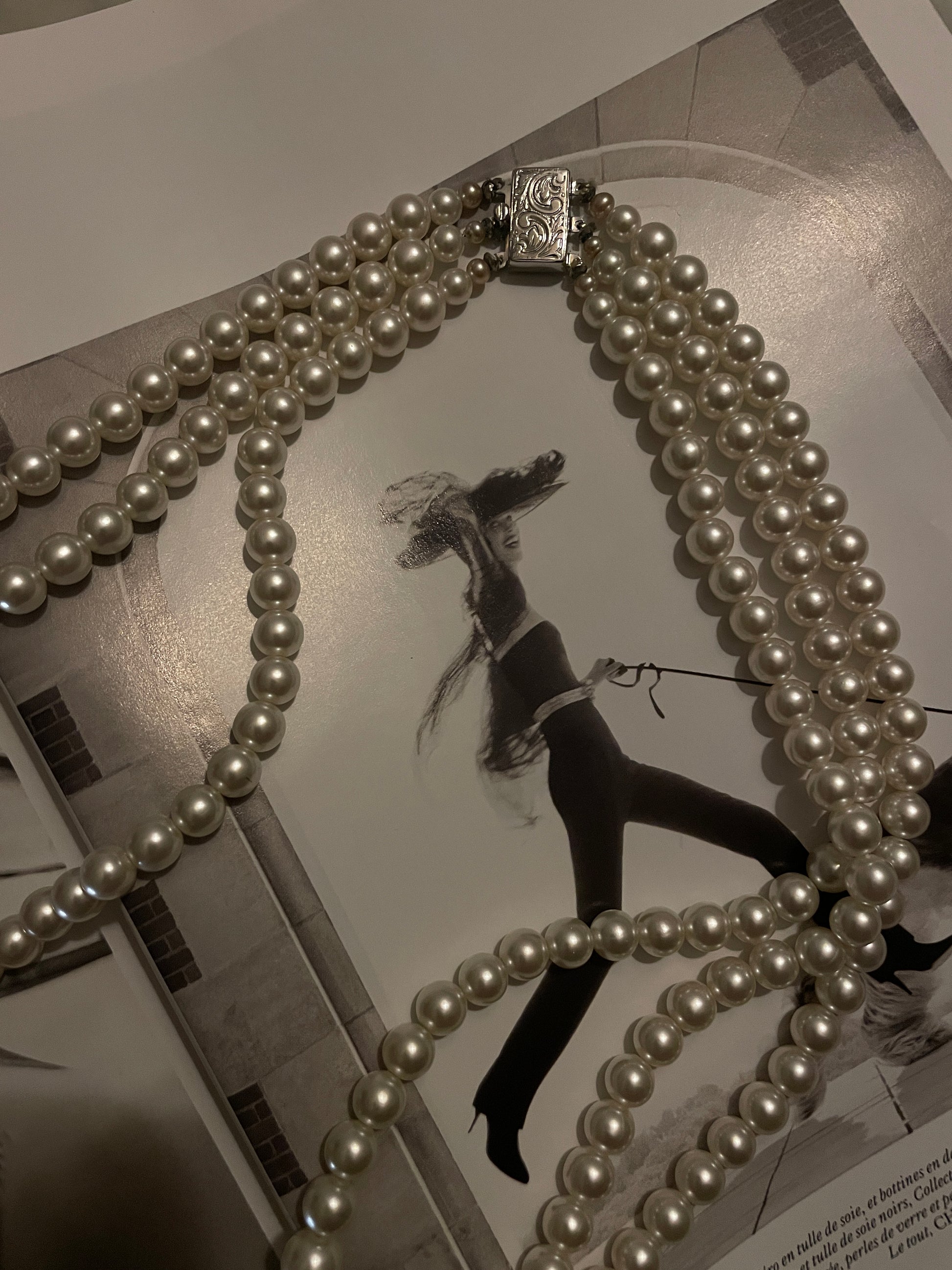 Prachtige vintage meerlaagse parelketting met een sierlijke, gedetailleerde sluiting. De ketting bestaat uit drie strengen elegante roomwitte parels met een klassieke uitstraling. De sluiting heeft een prachtig gegraveerd patroon en geeft de ketting een luxueuze, tijdloze look. Perfect voor speciale gelegenheden, bridal styling, of als chique statement piece.