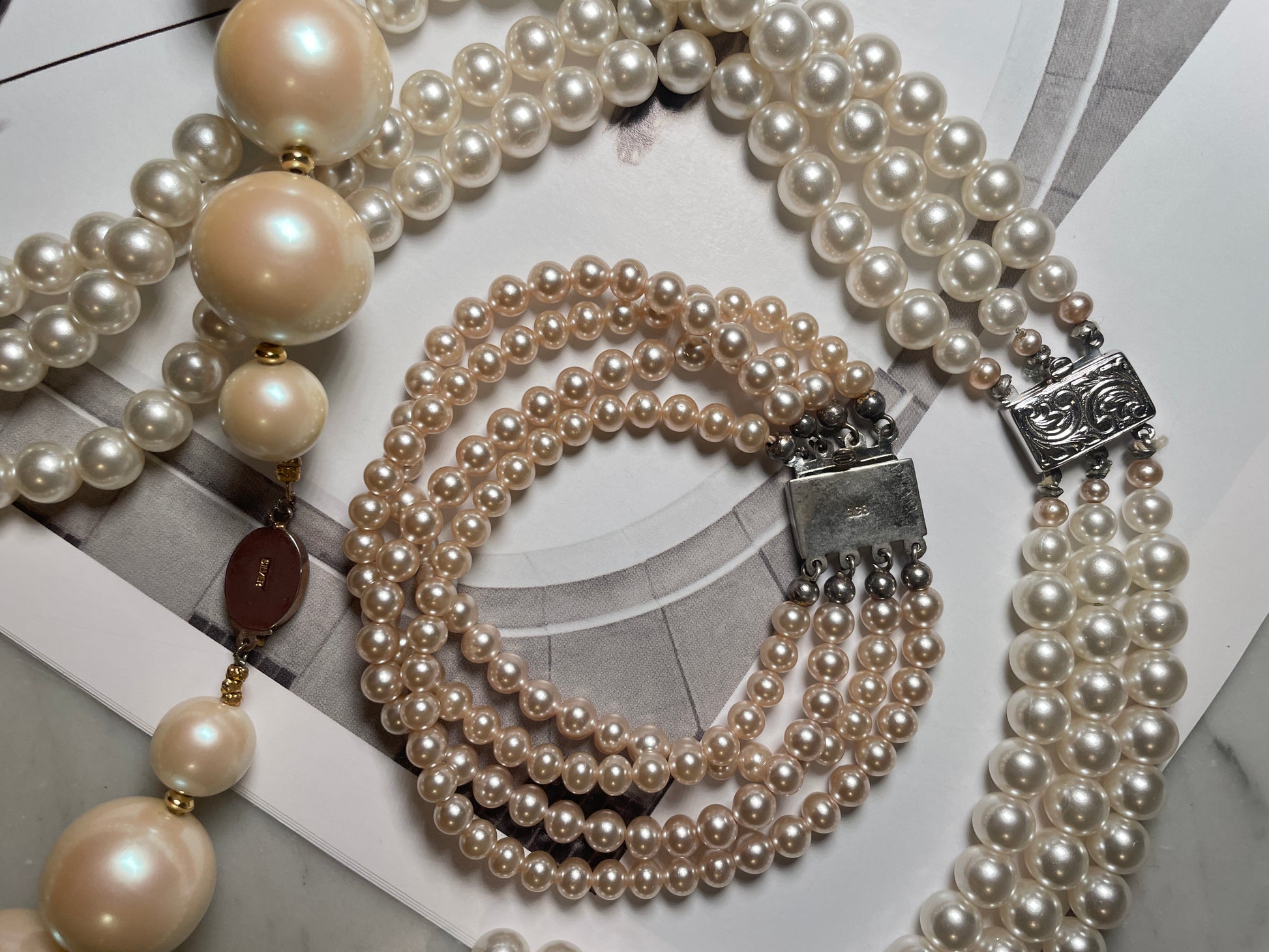 De parels zijn waarschijnlijk imitatieparels, maar van hoogwaardige kwaliteit (glans, kleur en uniformiteit wijzen daarop). De sluiting is vintage en gemerkt.