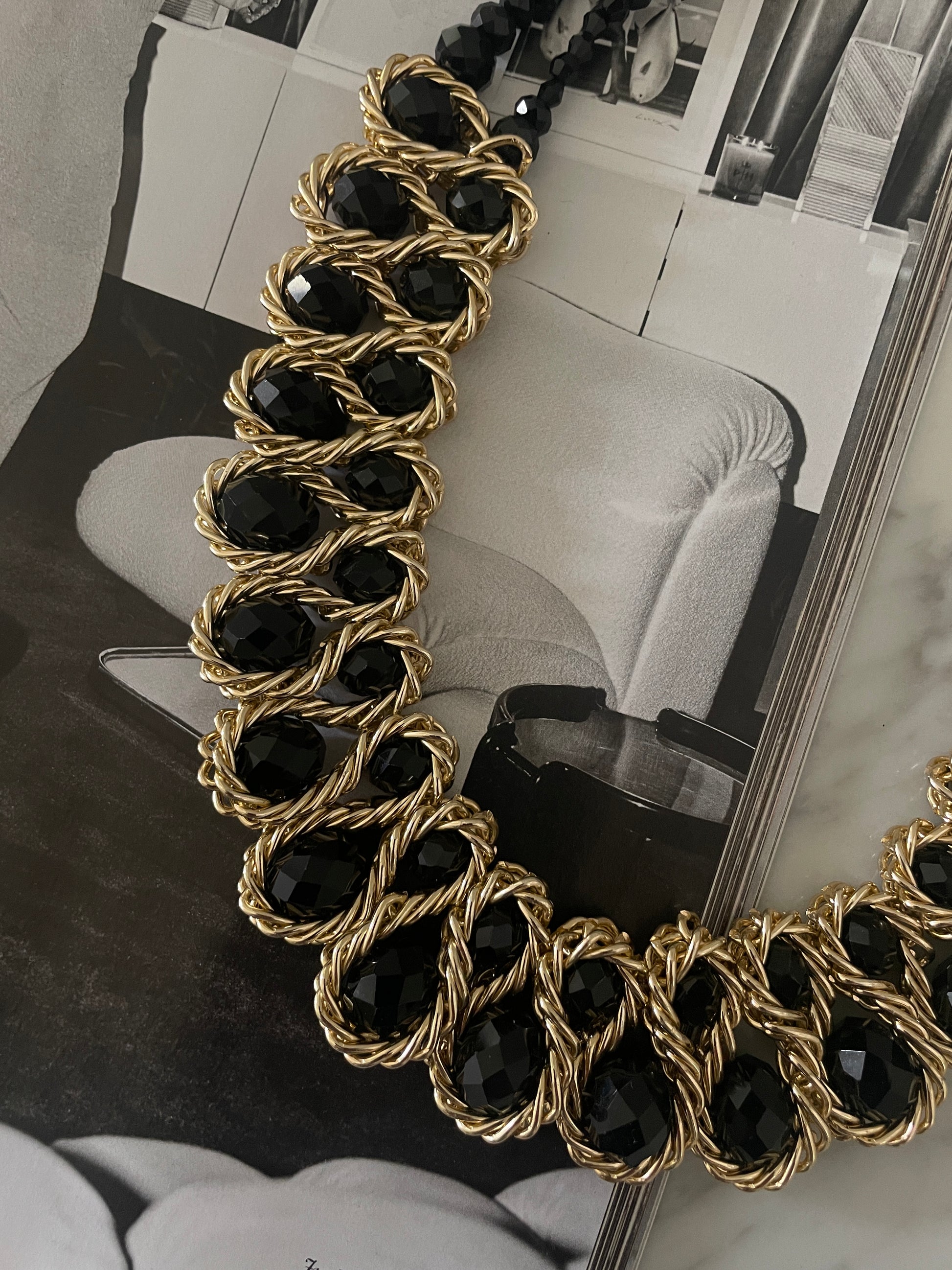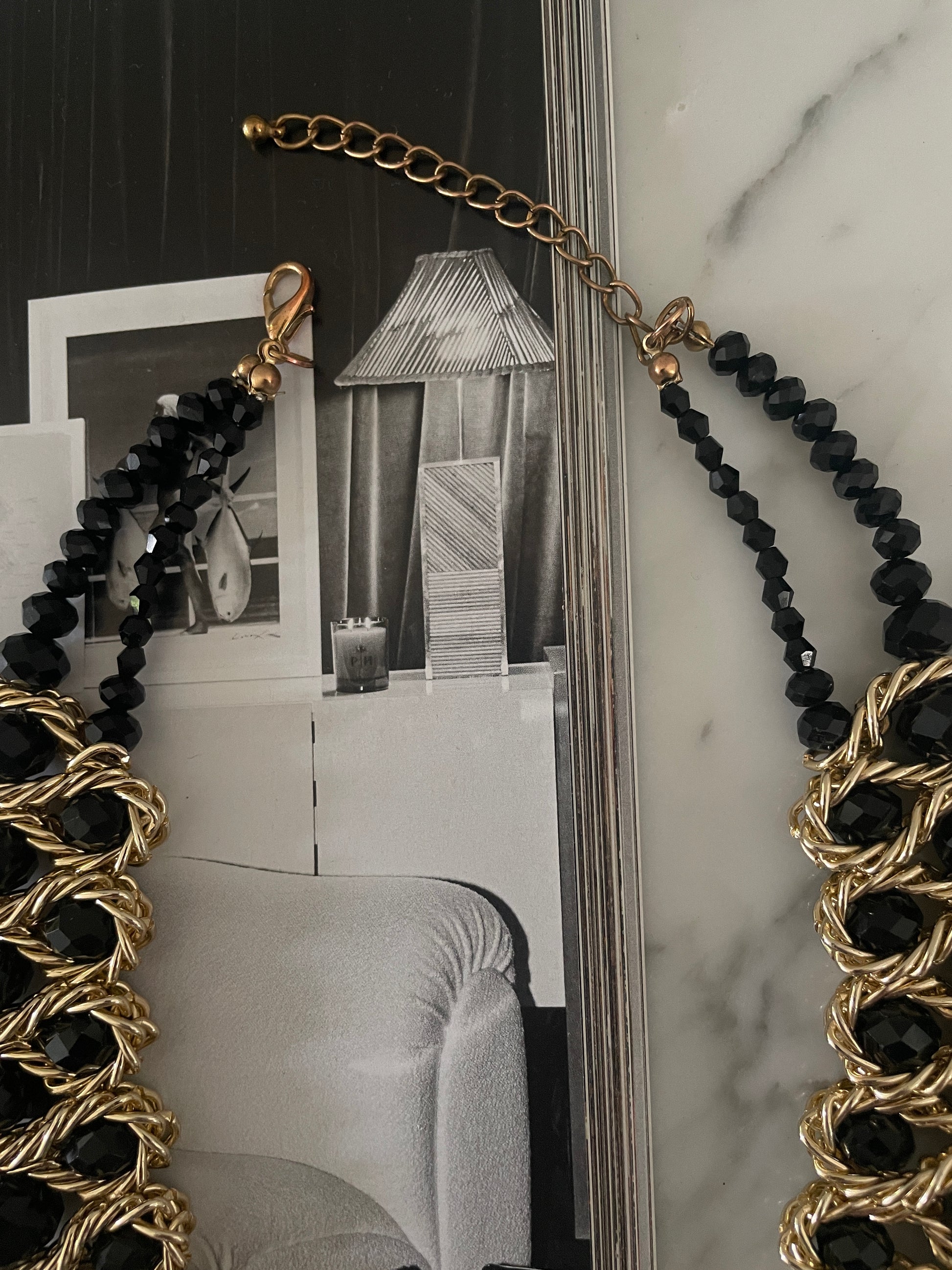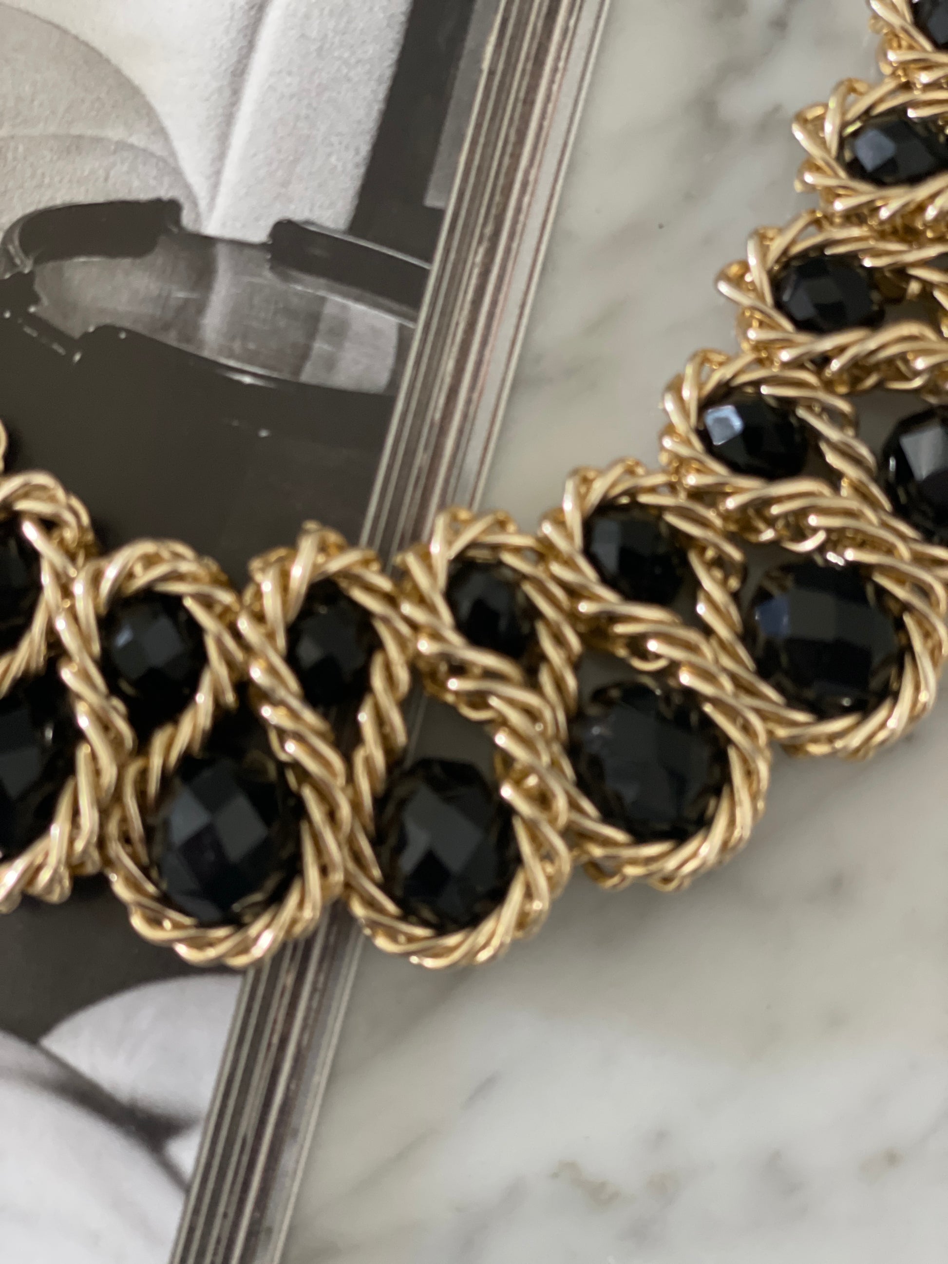 Deze prachtige vintage ketting in zwart met goud is een echte eyecatcher die elegantie en kracht uitstraalt. Met zijn klassieke kleurcombinatie past hij perfect bij zowel een chique avondlook als een stijlvolle everyday outfit. De ketting is uniek, met verfijnde details die doen denken aan de Parijse haute couture.
