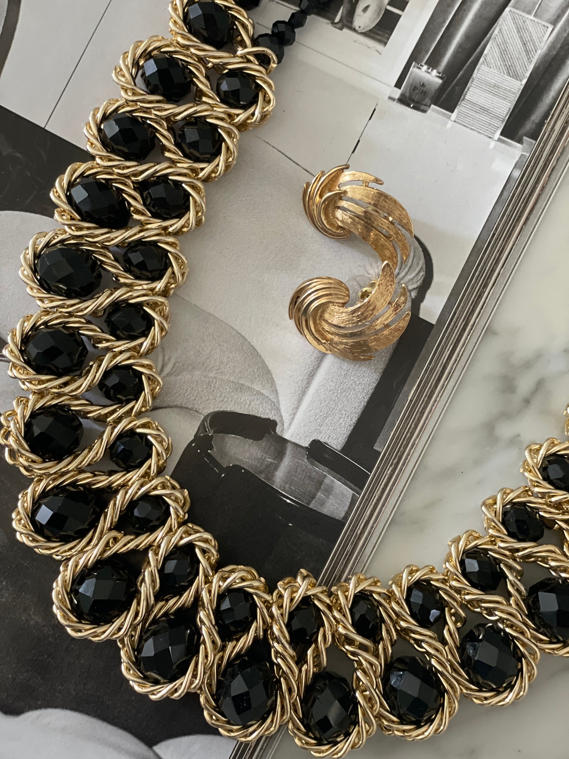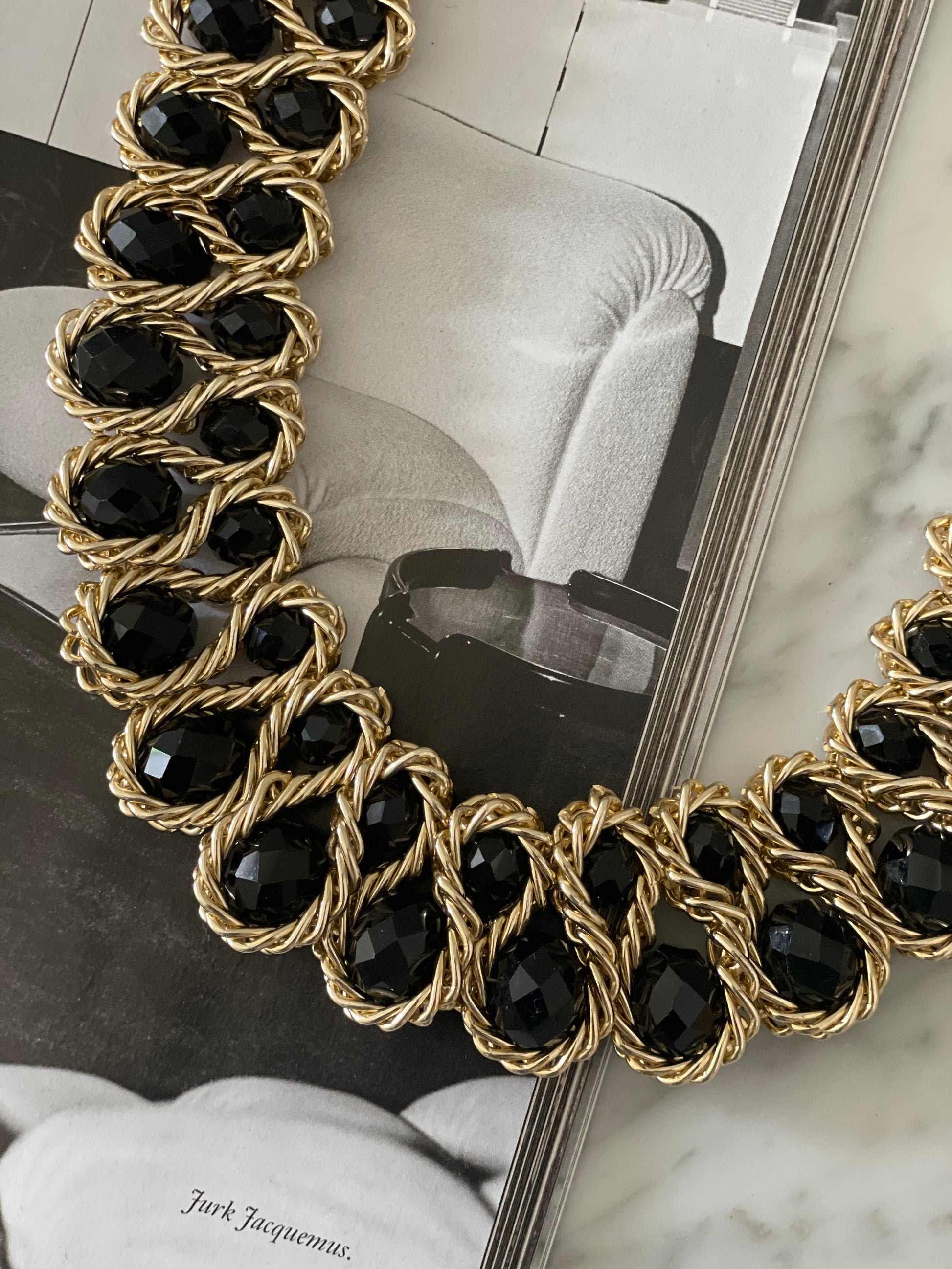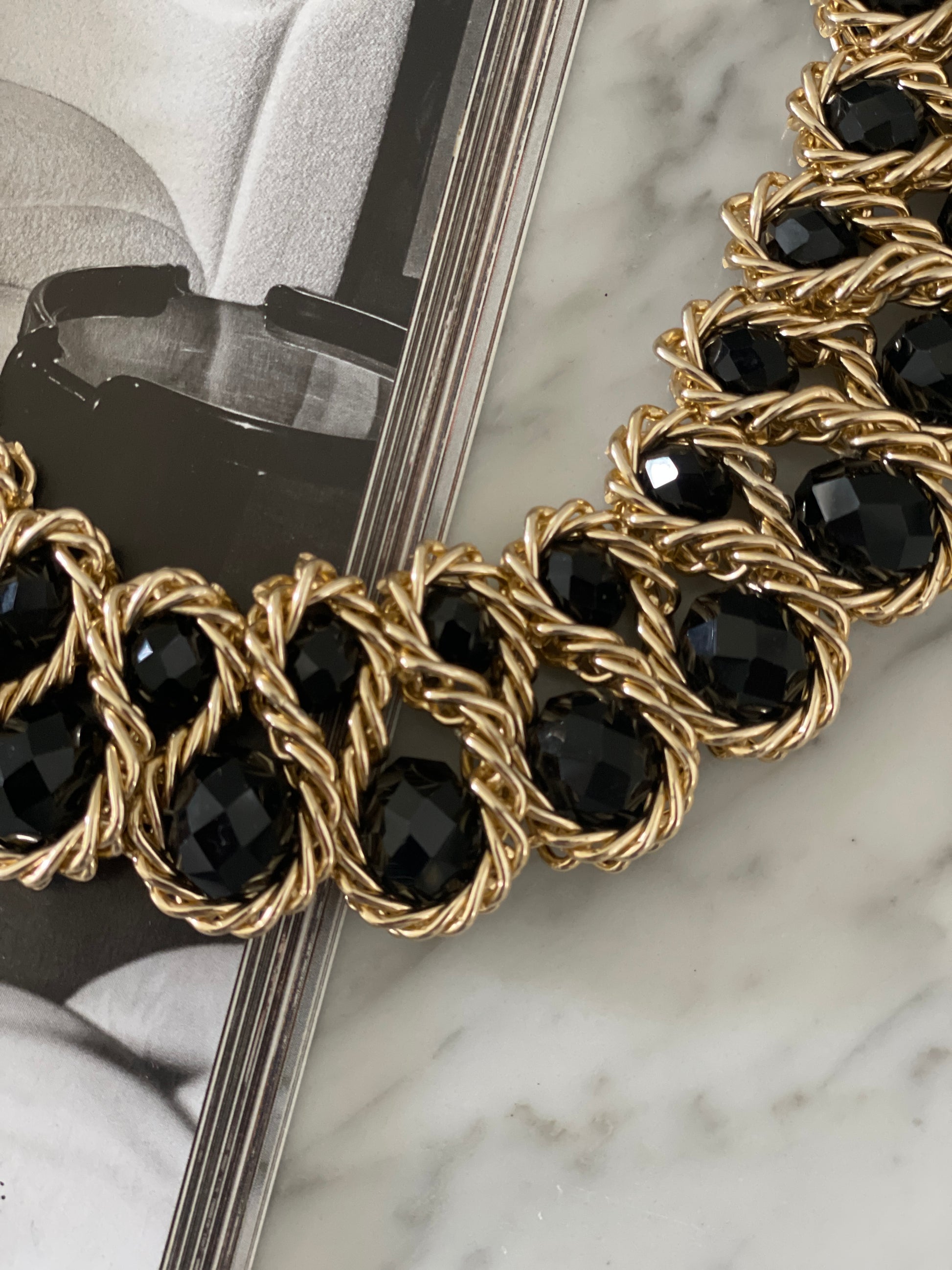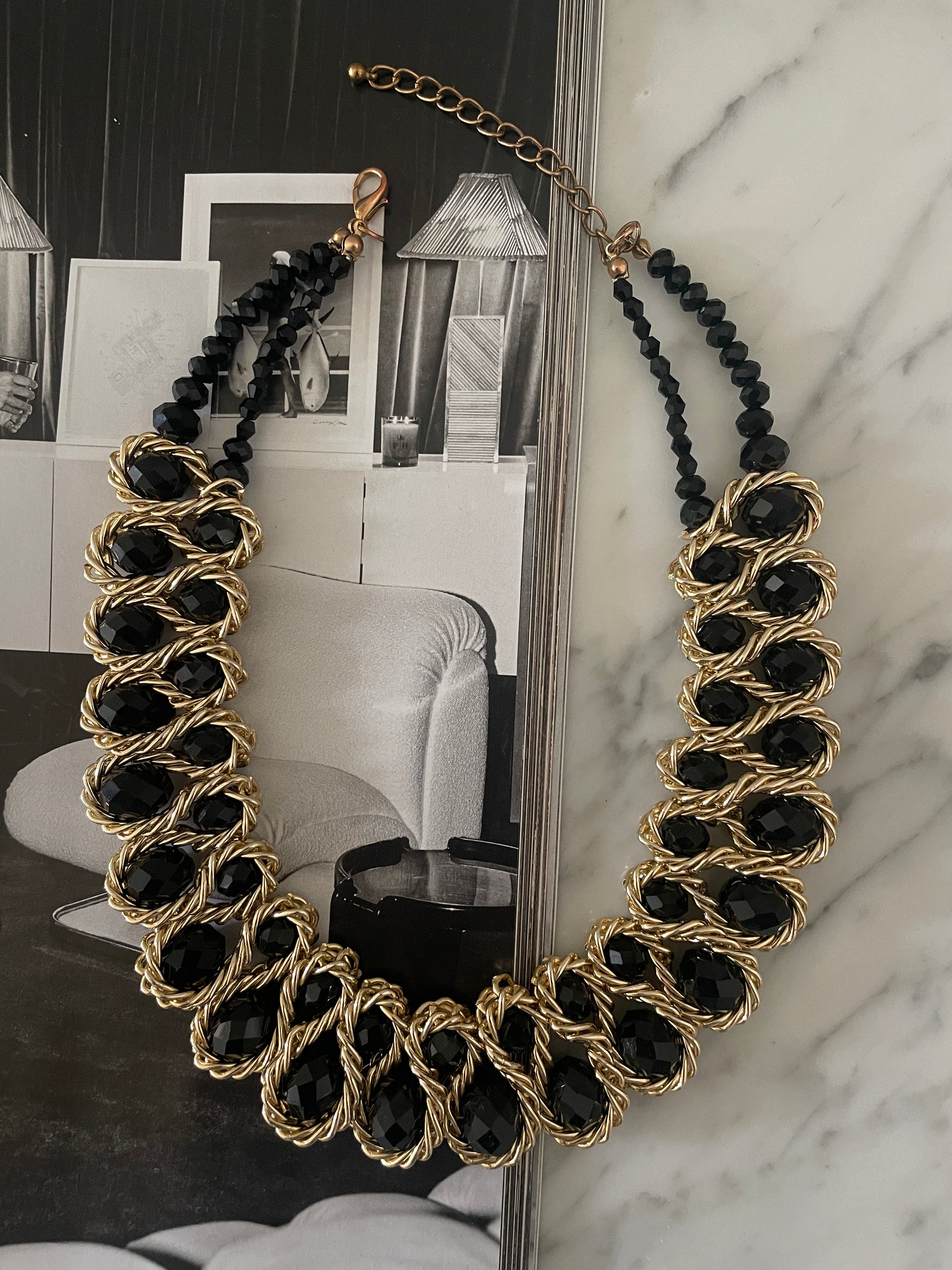 Deze prachtige vintage ketting in zwart met goud is een echte eyecatcher die elegantie en kracht uitstraalt. Met zijn klassieke kleurcombinatie past hij perfect bij zowel een chique avondlook als een stijlvolle everyday outfit. De ketting is uniek, met verfijnde details die doen denken aan de Parijse haute couture.